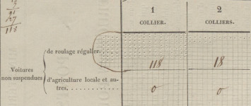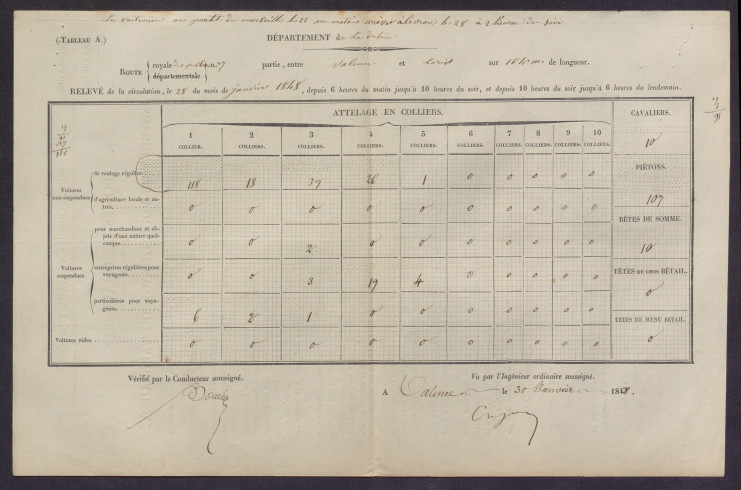 Détail du tableau A : relevé de la circulation le 28 du mois de Janvier 1848 sur la portion de la route royale n° 7 entre Valence et Loriol
