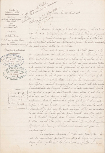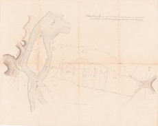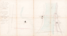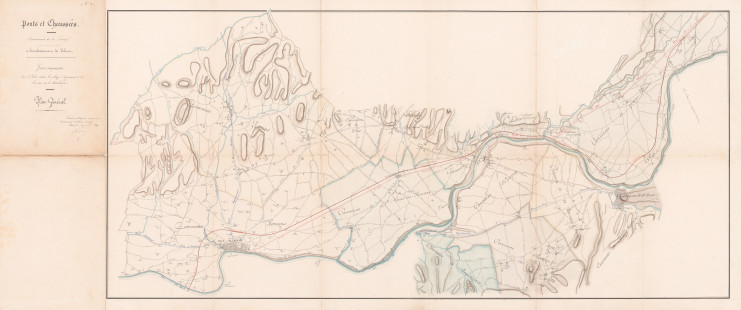 Plans généraux établis pour le pont suspendu d'Eymeux avec les trois tracés étudiés en 1851, 1860 et 1865 (3 S 47)